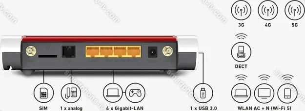 - 1x USB 3.0, 4x Gb LAN, Wi-Fi 5 (WLAN 802.11a/b/g/n/ac), DECT, 1x Phone analog