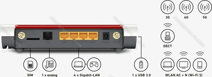 - 1x USB 3.0, 4x Gb LAN, Wi-Fi 5 (WLAN 802.11a/b/g/n/ac), DECT, 1x телефонный аналоговый