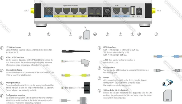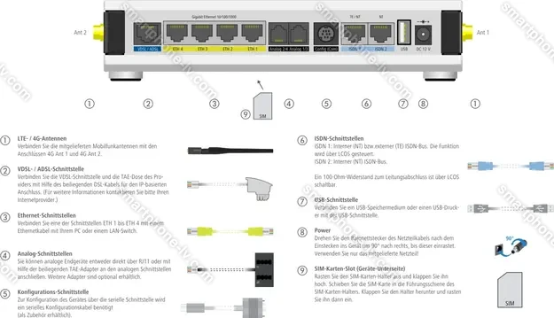 - Точка доступа, разъем для антенны (мобильная сеть), VLAN, VDSL2-Vectoring (Profile 17a, Profile 30a), VDSL2-SuperVectoring (Profile 35b), IPv6, VoIP, сквозное подключение VPN (PPTP/L2TP/IPSec/SSL), VPN (5 IPSec-Tunnel)